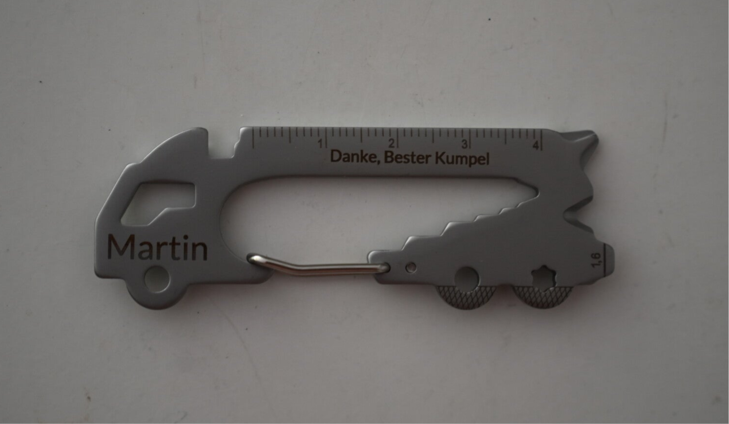 Entdecken Sie unser einzigartiges Multitool mit Karabiner der Firma ROMINOX® in Form eines LKWs, gefertigt aus hochwertigem, langlebigem Edelstahl. Mit insgesamt 22 praktischen Funktionen ist dieses Tool der perfekte Begleiter für unterwegs, beim Camping, im Auto oder im Haushalt.