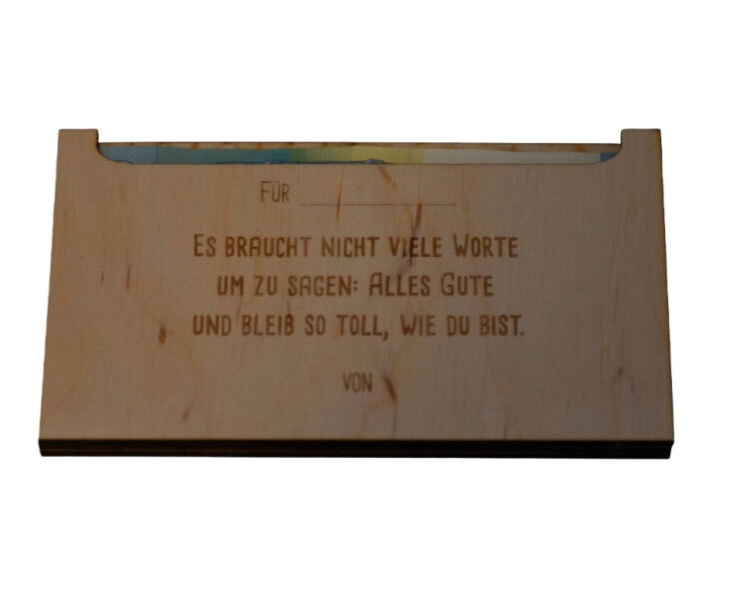Verschenke Geld auf besonders originelle Weise! Unser Geldgeschenk aus Birken- oder Lindenholz ist die perfekte Alternative zu langweiligen Umschlägen. Mit seiner natürlichen Holzoptik und der individuellen Gravur wird jedes Stück zu einem echten Hingucker.