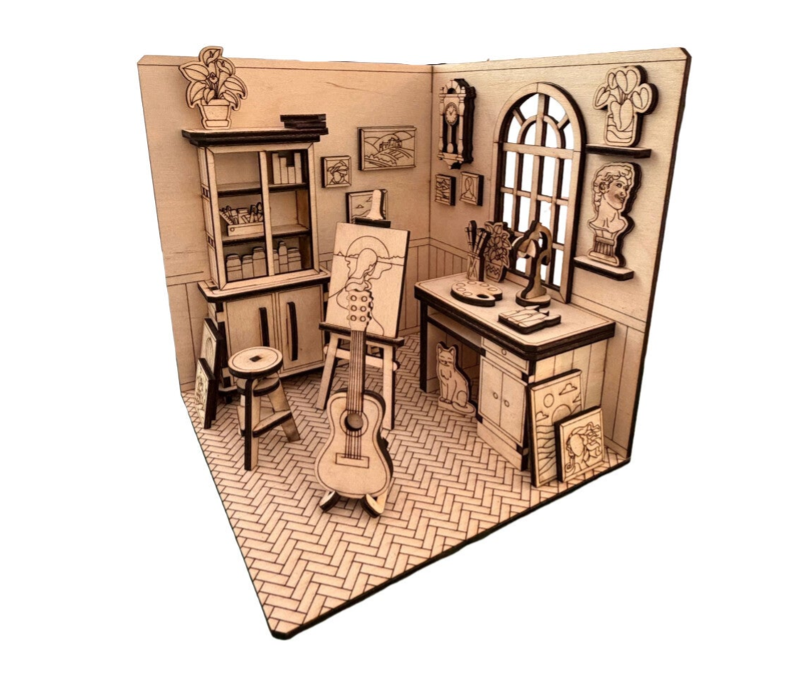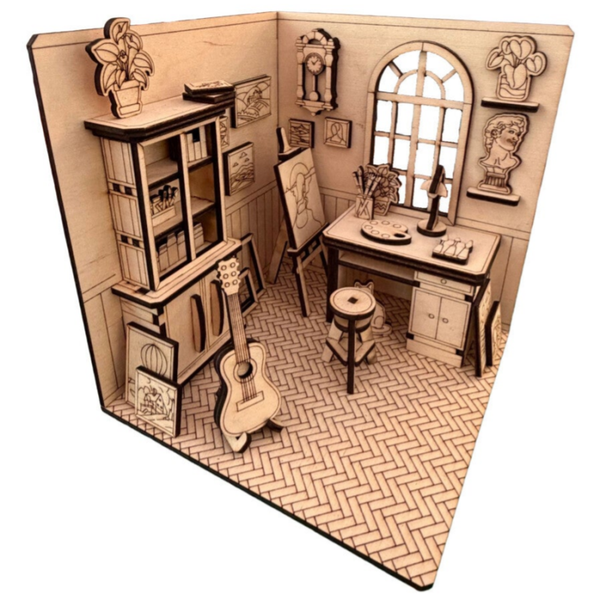 Als Bausatz eignet sich das Book Nook perfekt für Bastel- und Modellbau-Fans. Beim Zusammenbau entsteht Schritt für Schritt ein atmosphärisches Künstlerzimmer mit besonderem Tiefeneffekt zwischen deinen Büchern.