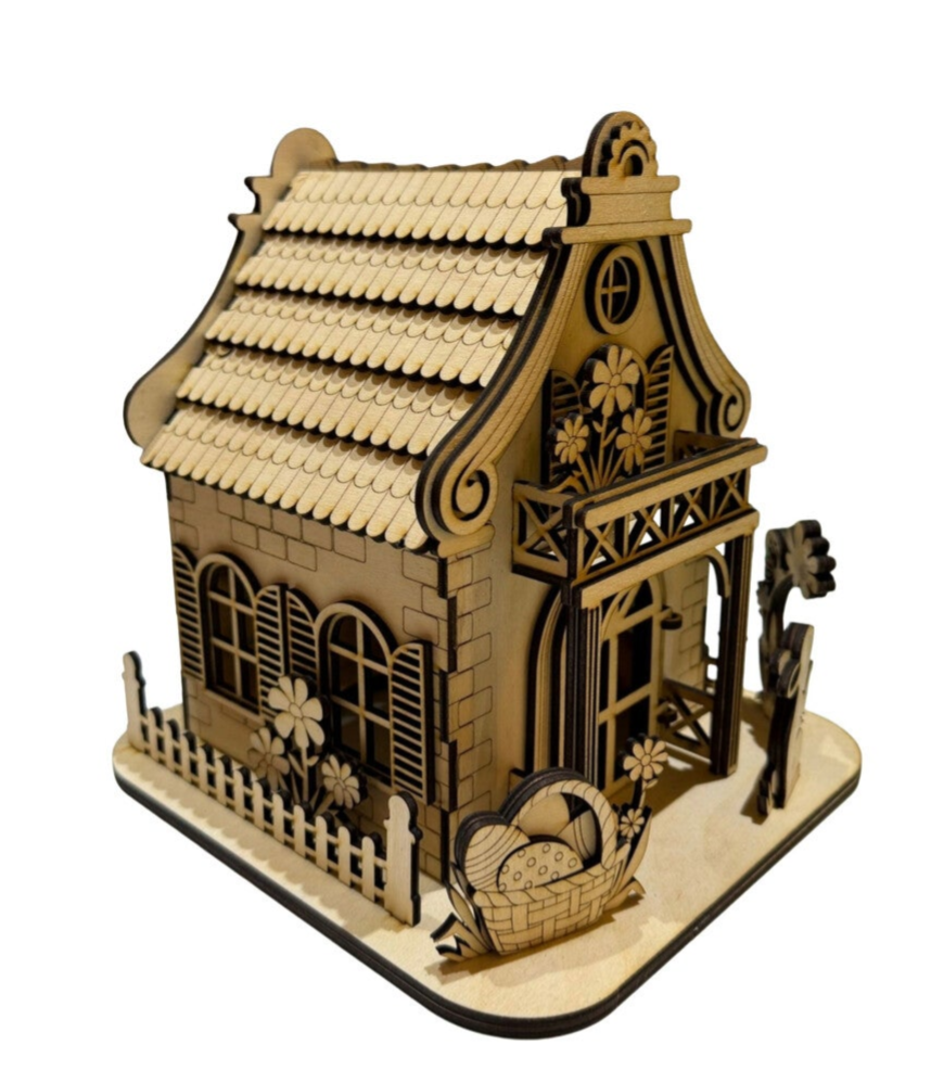 Dieses detailreiche Osterdeko-Holzhaus bringt frühlingshafte Stimmung in dein Zuhause. Gefertigt aus Birken- oder Lindenholz, überzeugt der Bausatz durch seine natürliche Optik und filigrane Verarbeitung. Verspielte Osterelemente sowie ein dekorativer Balkon machen das Haus zu einem besonderen Blickfang auf Tisch, Fensterbank oder Sideboard.